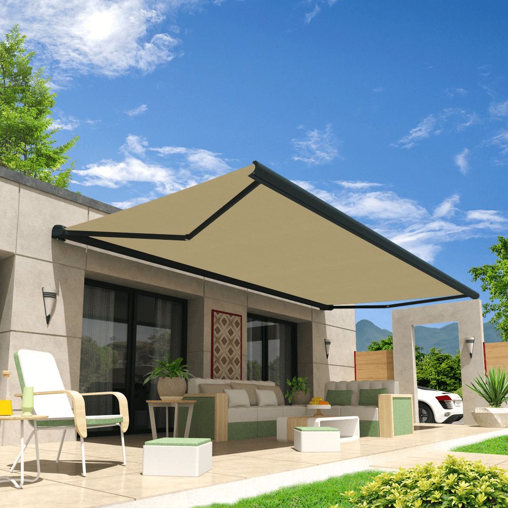 É um toldo de terraço resistente aos raios UV e às intempéries. Braço de cabo duplo. Tela permanentemente esticada. Sua máquina permite que um manuseio fácil. Lembre-se de abrir o seu toldo de manhã para beneficiar da frescura durante todo o dia no seu terraço.